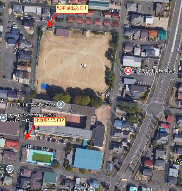 校庭の臨時駐車場をご利用ください。入り口は北西の角です( 駐車場出入口1) 。